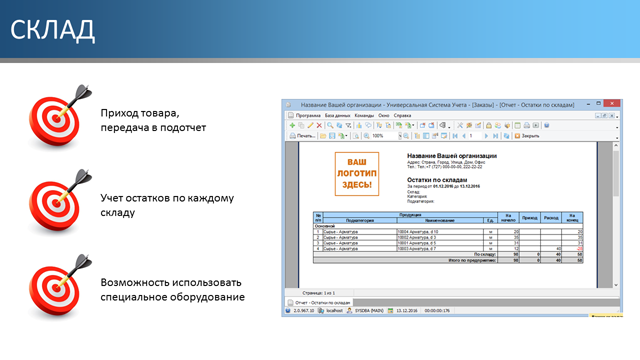 - В УСУ для учета и калькулирования себестоимости можно вести полный учет по складам – контролировать движение товаров, автоматически списывать продукцию при продаже или оказании услуги, задавать неснижаемый остаток, настраивать специальные напоминания и создавать отчет по остаткам;