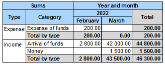 A cross report will be presented at the top, where total amounts are calculated at the junction of financial items and calendar months. Due to such a universal view, users will be able not only to see the total turnover for each cost item , but also to track how the amount of each type of expense changes over time.