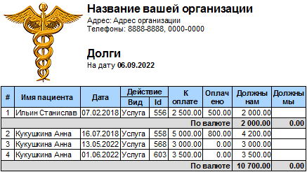 Таким образом пациенту можно озвучить не только общую сумму долга, но и, при необходимости, перечислить определенные даты посещения врача, за которые не была произведена оплата за оказанные услуги.