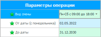 Данное действие позволяет выбрать вид смены и период времени, в течение которого работник будет работать именно по данному виду смены.