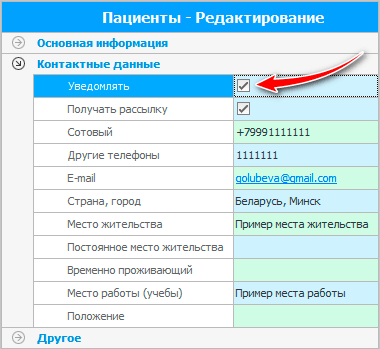 По умолчанию большинство клиентов, конечно же, согласны получать уведомление о готовности своих результатов лабораторных исследований. Регулируется это "в карточке пациента" полем "Уведомлять".