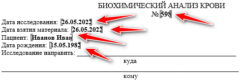 Многие значения могут вставляться автоматически в шаблон документа. Например, доступно автоматическое заполнение шаблона документа данными пользователя. Давайте откроем "запись пациента" на "Биохимический анализ крови".