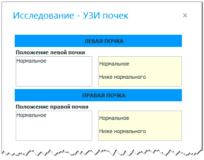 Если параметров очень много или они сильно различаются по тематике, можно создать отдельные группы. Например, для "Ультразвукового исследования почек" есть параметры для левой почки и для правой почки. При внесении результатов параметры "УЗИ" могут быть вот так разделены.
