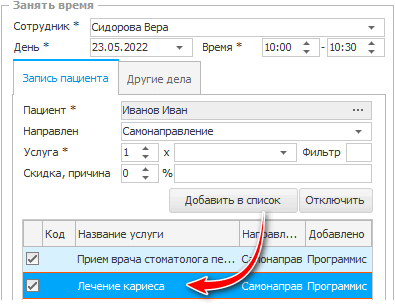 Работники регистратуры запишут пациента на первичный или повторный прием к врачу - это одна услуга. Сам врач уже имеет возможность добавить дополнительные услуги в окне записи пациента согласно выполненной работе. Например, был пролечен только кариес в одном зубе. Давайте добавим вторую услугу "Лечение кариеса".