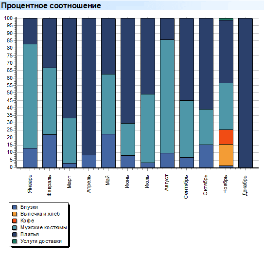 Отображение процентного соотношения объемов реализации по подкатегориям по каждому месяцу периода.