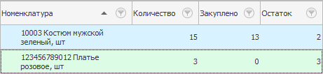 По каждой номенклатуре рассчитывается, сколько товара "осталось" закупить.