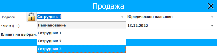 Теперь для смены сотрудника в окне продажи в правой верхней области выберем имя сотрудника из списка.