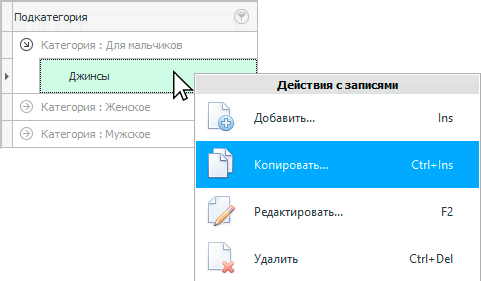 В категорию "Для мальчиков" можно добавить еще много подкатегорий, которые будут олицетворять другие виды одежды. Чтобы ускорить свою работу, и каждый раз не заполнять поле "Категория" значением "Для мальчиков", можно при добавлении новой записи в таблицу выбирать из контекстного меню не команду "Добавить", а команду "Копировать". Именно так вы сможете копировать запись.