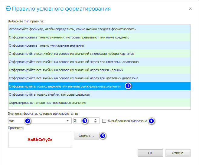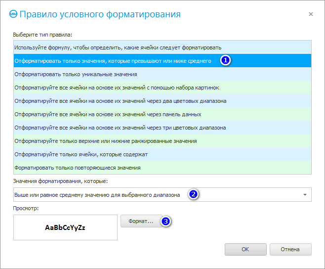 В появившемся окне выберите правило "Отформатировать только значения, которые превышают или ниже среднего". Затем в выпадающем списке ниже выберите "Выше или равно среднему значению для выбранного диапазона". По нажатию кнопки "Формат" измените немного размер шрифта и сделайте шрифт полужирным.