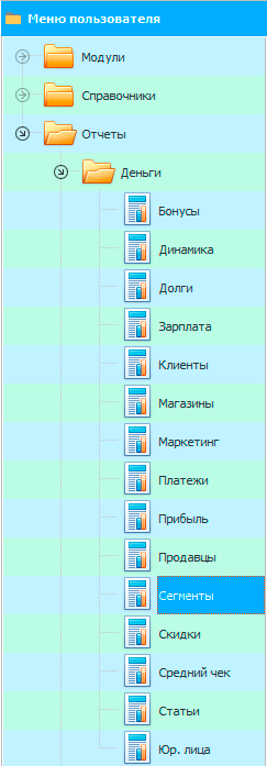Панель инструментов отчета содержит команды для работы с отчетами. Давайте зайдем, например, в отчет "Сегменты", который показывает, в каком диапазоне цен товар чаще покупают.