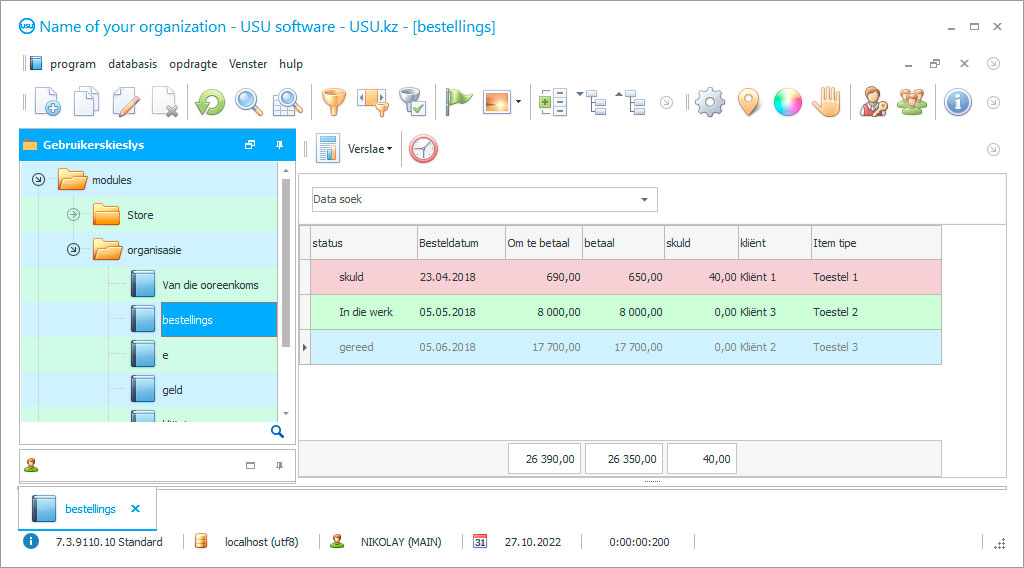 Die hoofdoel van ons sagtewareproduk is om kantore van hoë gehalte te voorsien. Verskaf verslae oor uitgawes, inkomste, stadiums van uitvoering van die bestelling, en meer. Analiseer die resultate van die aksies wat u onderneem om sekere gevolgtrekkings te maak en die kantore as geheel te verbeter. Neem die roetine-instandhouding van dokumente oor, bespaar tyd en laat meer aandag toe aan die verbetering van die dienssentrum.