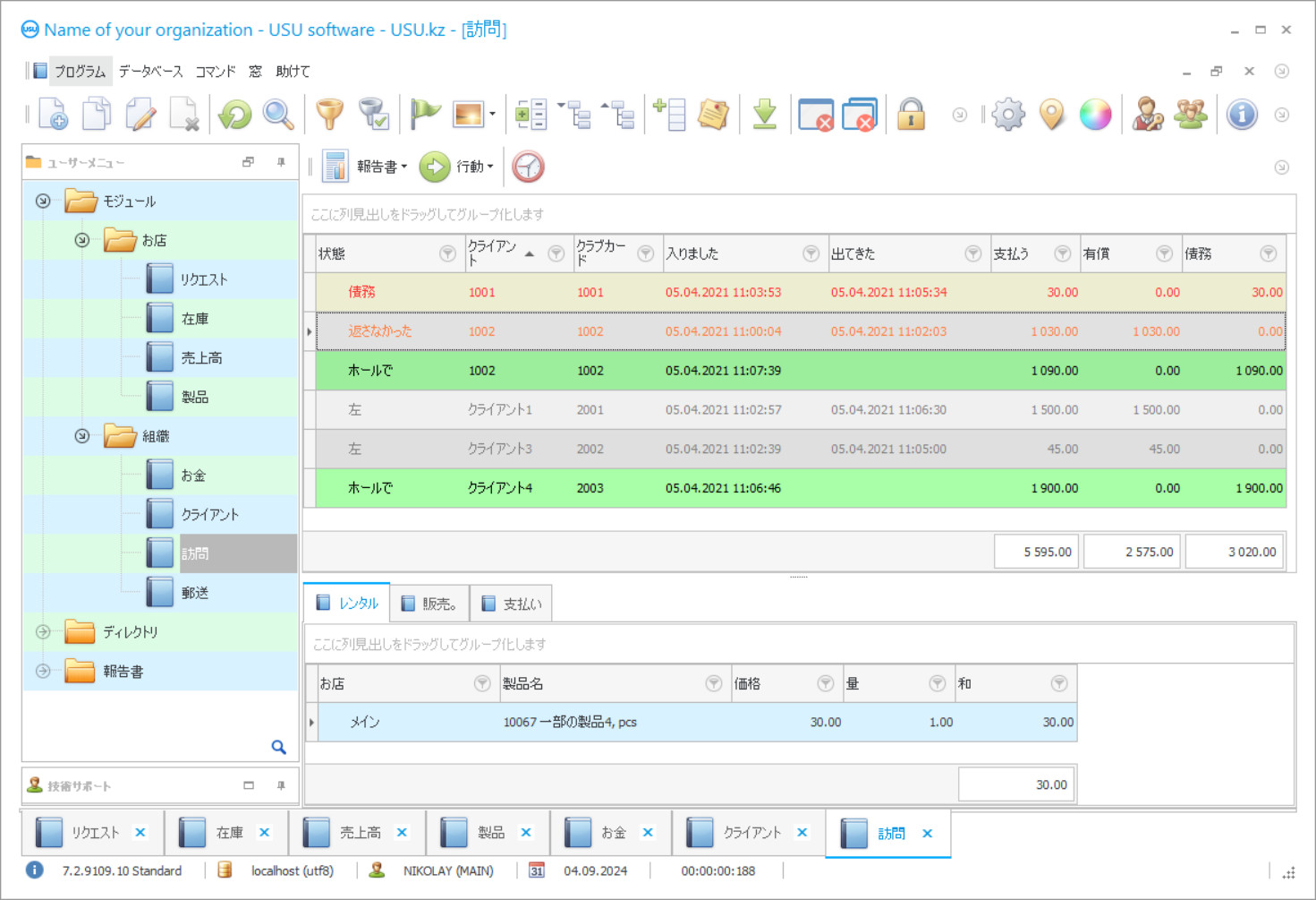 サウナとスチームバスのプログラムは、従業員の作業時間を節約するために、そのような一見目立たない方法を数多く使用しています。これは、プログラムの主要なタスクの1つです。たとえば、別の効果的なツールは、現在のインジケーターの色表示です。これにより、従業員はプロセスと作業期限の遵守を視覚的に監視できます。これは、プログラム自体がこれらすべてを制御し、一部で発生する可能性のある望ましくない状況についてスタッフに通知するためです。ポイント、注目を集めるために赤で警告します。サウナとバスのプログラムが顧客、時間、支払いの記録を保持する注文データベースでは、各訪問には独自の色があり、この訪問のステータスを示します—完了、実行中、現時点で完了、未払い、完了ずっと前に、そうでなければ借金があります。たとえば、アクティブな訪問は緑色で、クライアントが手続きを完了するとすぐに支払いリマインダーが表示されます。前払い条件がない場合、さらに、クライアントは追加のサービス、1時間ごとの家賃の在庫を受け取ることができます。色の変更は自動的に行われます。