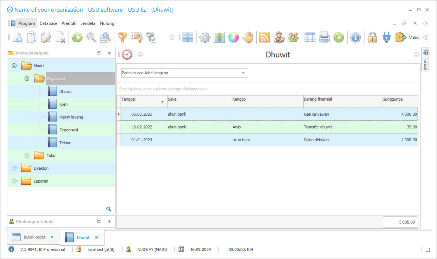 Program finansial njaga akuntansi lengkap babagan penghasilan, biaya, bathi, lan uga ngidini sampeyan ndeleng informasi analitis ing bentuk laporan.
