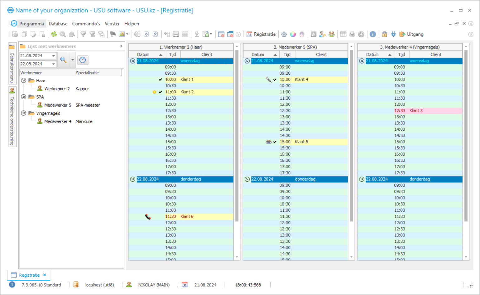 Wanneer een persoon er slank uit wil zien, zijn dat veel mogelijkheden om dergelijke dromen te verwezenlijken. Begin met sporten, volg een dieet, ga naar de sportschool enzovoort. Wanneer iemand honger voelt, heeft hij of zij een idee om naar een winkel of restaurant te gaan. Als een persoon er mooi uit wil zien, gaat hij of zij naar een schoonheidssalon. Hoewel de vraag zelf niet correct is gesteld. Niet 'WANNEER iemand er mooi uit wil zien', want hij of zij wil er altijd mooi en prestigieus uitzien. Daarom is het nodig om regelmatig diensten aan te vragen in de schoonheidssalons, die tal van mogelijkheden bieden om schoonheid te behouden. Als u de eigenaar bent van een schoonheidssalon, vraagt u zich waarschijnlijk vaak af hoe u uw bedrijf zo efficiënt mogelijk kunt organiseren, rekening houdend met alle factoren en kenmerken die typerend zijn voor dit soort industrie. Het is erg moeilijk om het handmatig te doen, zonder de hulp van de vooruitgang in de technologische industrie. Velen verlaten de traditionele methode van procesbeheersing al in productie en bedrijven die verschillende diensten verlenen. Tegenwoordig introduceren ze nieuwe technologieën en installeren ze speciale programma's die de meeste taken alleen kunnen uitvoeren, terwijl ze het leeuwendeel van de tijd van het personeel vrijmaken. Deze tijd kan en moet anders en efficiënter worden gebruikt - bijvoorbeeld door dergelijke taken op te lossen, die alleen door een persoon kunnen worden gedaan, niet door een machine. Het schoonheidssalonprogramma is moeilijk te vervangen door andere systemen, aangezien de functionaliteit van het programma nauwelijks geëvenaard wordt door andere software. We hebben ons best gedaan om het programma speciaal te maken, zodat u zich geen zorgen hoeft te maken over het feit dat er nog iets beters op de markt is. Dat is er gewoon niet.