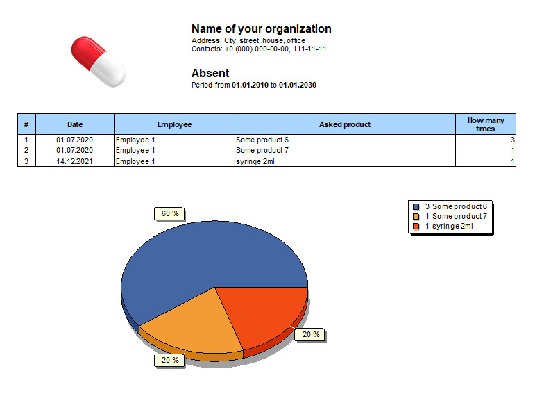 All this work in the program for the accounting of medicines later pays off. So you will analyze the demand, practically without spending any additional funds, and the next time the desired product will definitely be in your warehouse. To see a beautiful infographic about the missing product, you need to go to the folder Reports - Store - Absent: