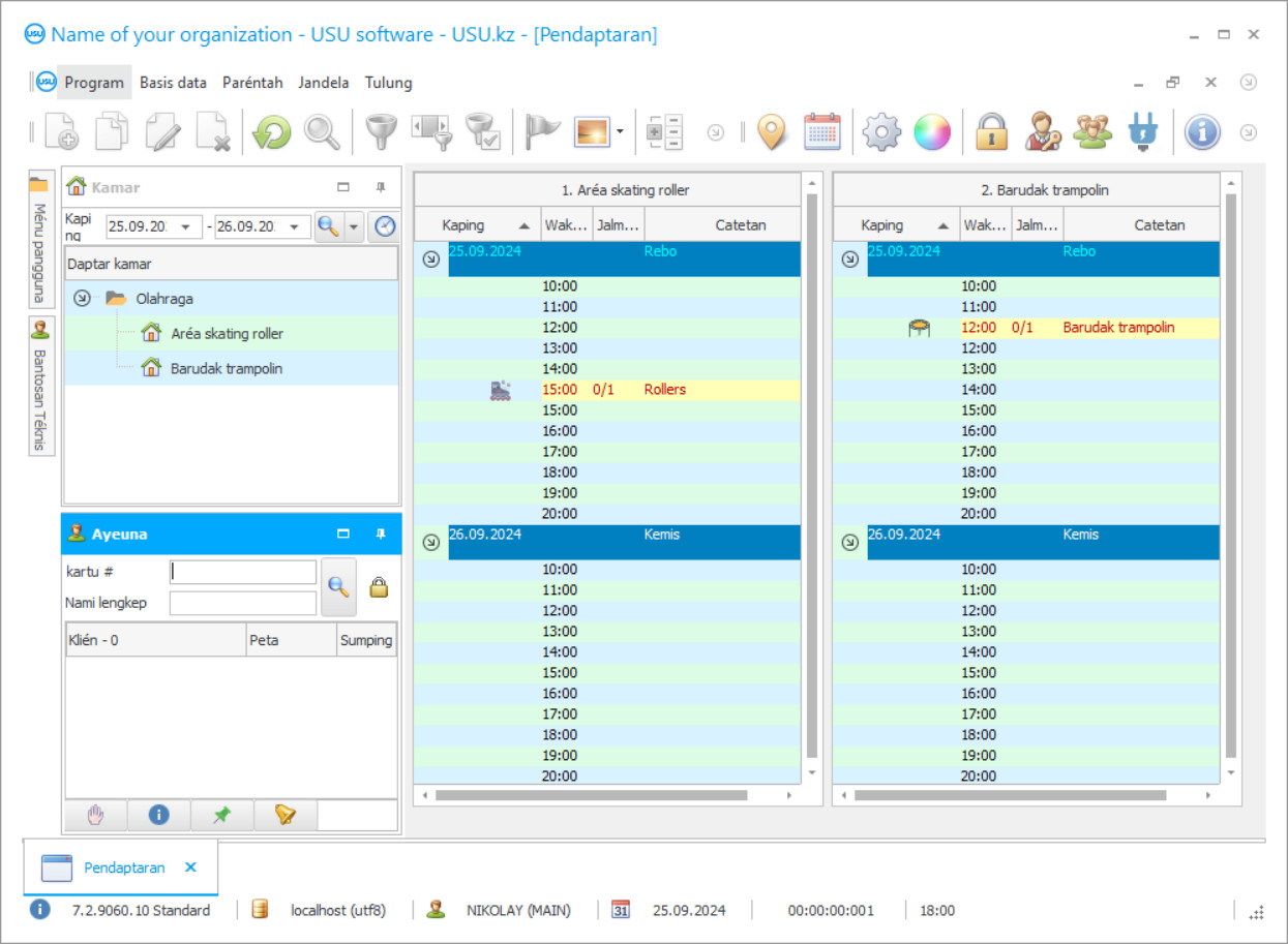 Konfigurasi Software USU pikeun pusat hiburan mangrupikeun solusi universal, sareng komprehensif pikeun organisasi sapertos taman trampolin, klub rol, gelanggang luncur umum, panjat tembok, pusat balap kart, bowling, sareng sajabina Konfigurasi ieu sampurna upami anjeun hoyong ngitung sareng ngitung sadaya hasil karya pusat hiburan anjeun, perkirakeun panghasilan sareng biaya perusahaan, nyatakeun kauntungan perusahaan, sareng seueur deui. Kontrol pusat hiburan bakal janten saderhana sareng merenah kusabab kanyataan yén pendaptaran unggal kunjungan pelanggan sareng pambayaran bakal nyandak ngan sababaraha detik ti karyawan anjeun.
