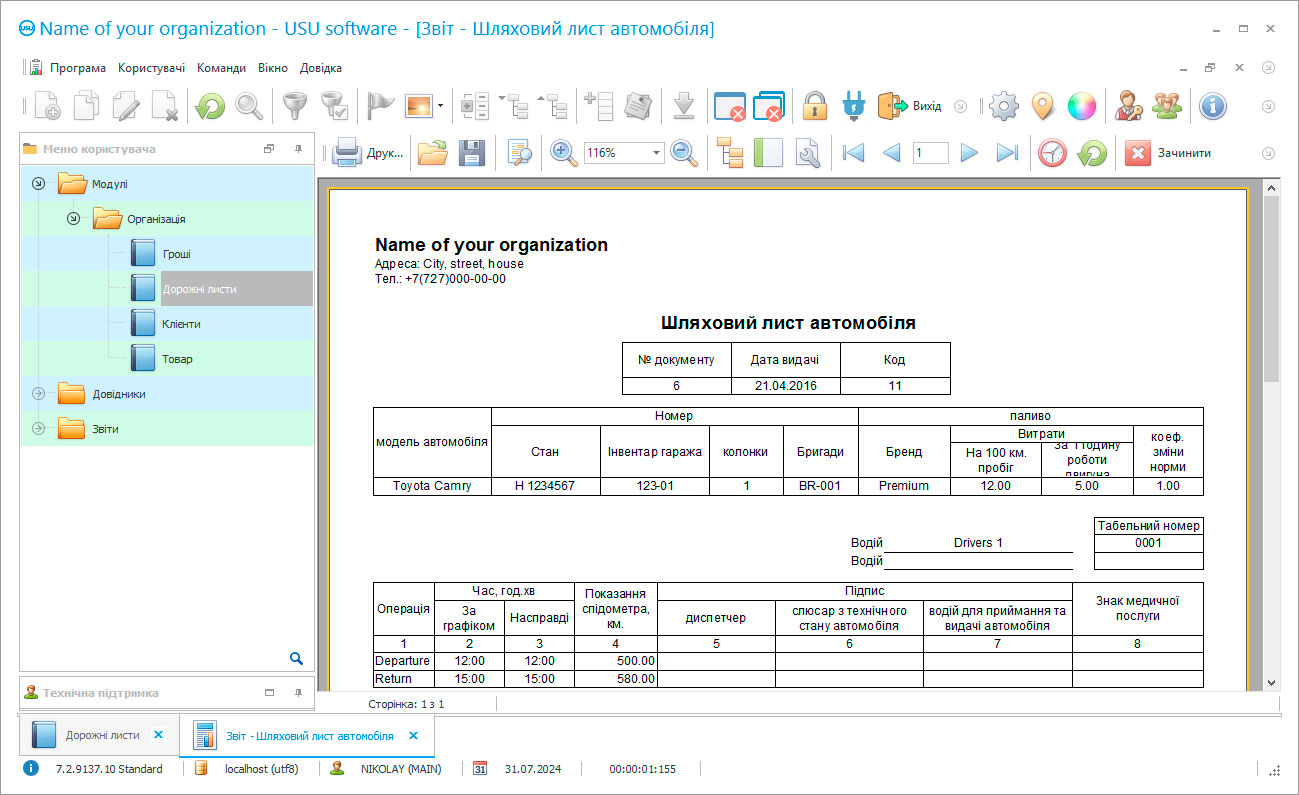 Комп'ютерна конфігурація програмного забезпечення УСУ є однією з найкращих програм для накладних, оскільки здатна врахувати цілу низку нюансів, які можуть бути лише в певному бізнесі, що може запропонувати не кожна конфігурація, або вимагатиме великих витрат. . У випадку з нашою програмою ціна залежить тільки від набору опцій, обраних замовником, навіть початківець підприємець може дозволити собі почати свою роботу за сучасними технологіями, відразу зробити правильні розрахунки, не відволікаючись на формування проїзних документів, маршрутні листи, все, що супроводжує експлуатацію легкових автомобілів, вантажівок. Комп’ютерна система дозволить розділити списання фінансів за видами витрат, з групуванням за автомобілями, видом палива, водієм. Саме такий підхід дозволить проводити правильні розрахунки, і найкращим чином контролювати переміщення паливно-мастильних матеріалів зі складу до легкових, вантажних автомобілів, відображаючи дані в проїзному листі, з паралельним порівнянням з нормами. , визначення якого зроблено на самому початку. Представлена розробниками УДУ комп’ютерна програма для накладних має широкий функціонал, що дозволить краще регулювати дорожні листи та маршрутні листи, проводити численні розрахунки, контролювати роботу автопарку, створювати комунікаційні мережі між підрозділами, створюючи оптимальні умови для досягнення цілей. На основі внутрішніх довідкових баз даних програма здійснюватиме моніторинг бензину, паливно-мастильних матеріалів для кожного легкового автомобіля та для всієї компанії. Електронні розрахунки в програмному забезпеченні накладної завжди допоможуть вам якнайкраще відслідковувати складські залишки пального та запчастин. Комп'ютерні алгоритми допоможуть визначити досягнення мінімального ліміту запасів і сповіщать про це користувачів.