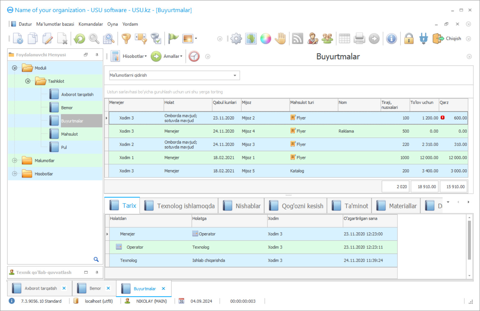USU dasturiy ta'minot tizimining (USU.kz) rasmiy veb-saytida bosmaxona IT-mahsulotlari juda keng assortimentda, shu jumladan, ishonchliligi, foydalanishda qulayligi va samaradorligi bilan ajralib turadigan bosmaxona uchun ixtisoslashtirilgan dasturda taqdim etilgan. Konfiguratsiyani chalkash deb atash mumkin emas. Malakali foydalanuvchilar dasturni tushunishda qiynalmaydilar, bosmaxonani qanday qilib malakali ravishda ishlashni, hozirgi bosmaxona jarayonlarini tartibga solishni va rejalashtirish bilan shug'ullanishni, normativ-huquqiy hujjatlarning shakllarini tayyorlashni va ombor ishlarini boshqarishni o'rgatishadi.