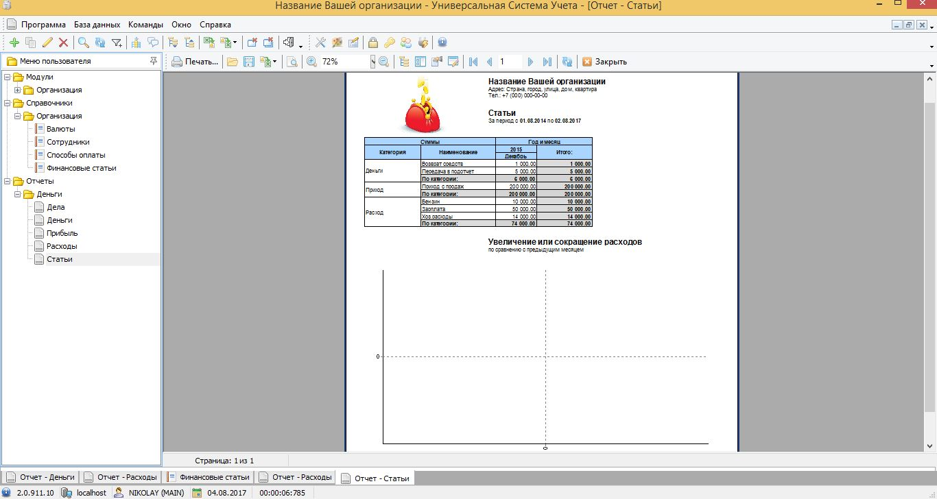 Лучшим средством для контроля работы любой фирмы является программное обеспечение Универсальная Система Учета. Оно поможет вам раскрыть потенциал компании и привести ее к успеху благодаря большим возможностям по организации, контролю деятельности фирмы, анализу и контролю ее результата.